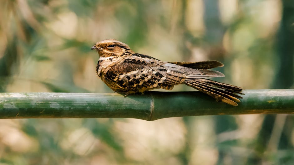 A brown and beige nightjar bird with patterned feathers is perched on a green bamboo stalk in a natural outdoor setting.